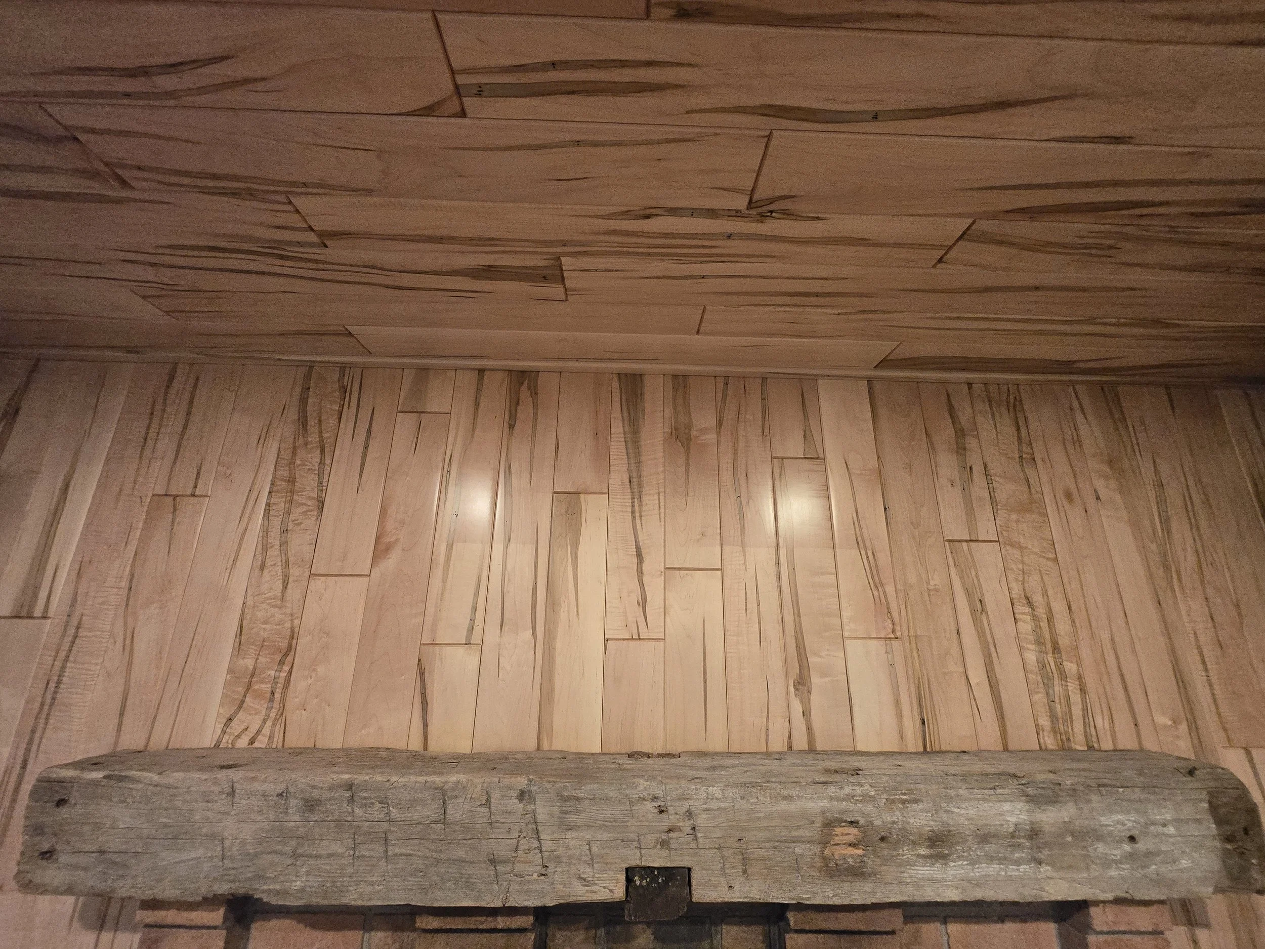 Soft Maple Ambrosia Paneling. Propriestary prefinish. Kiln dried farm lumber used for fireplace mantle.