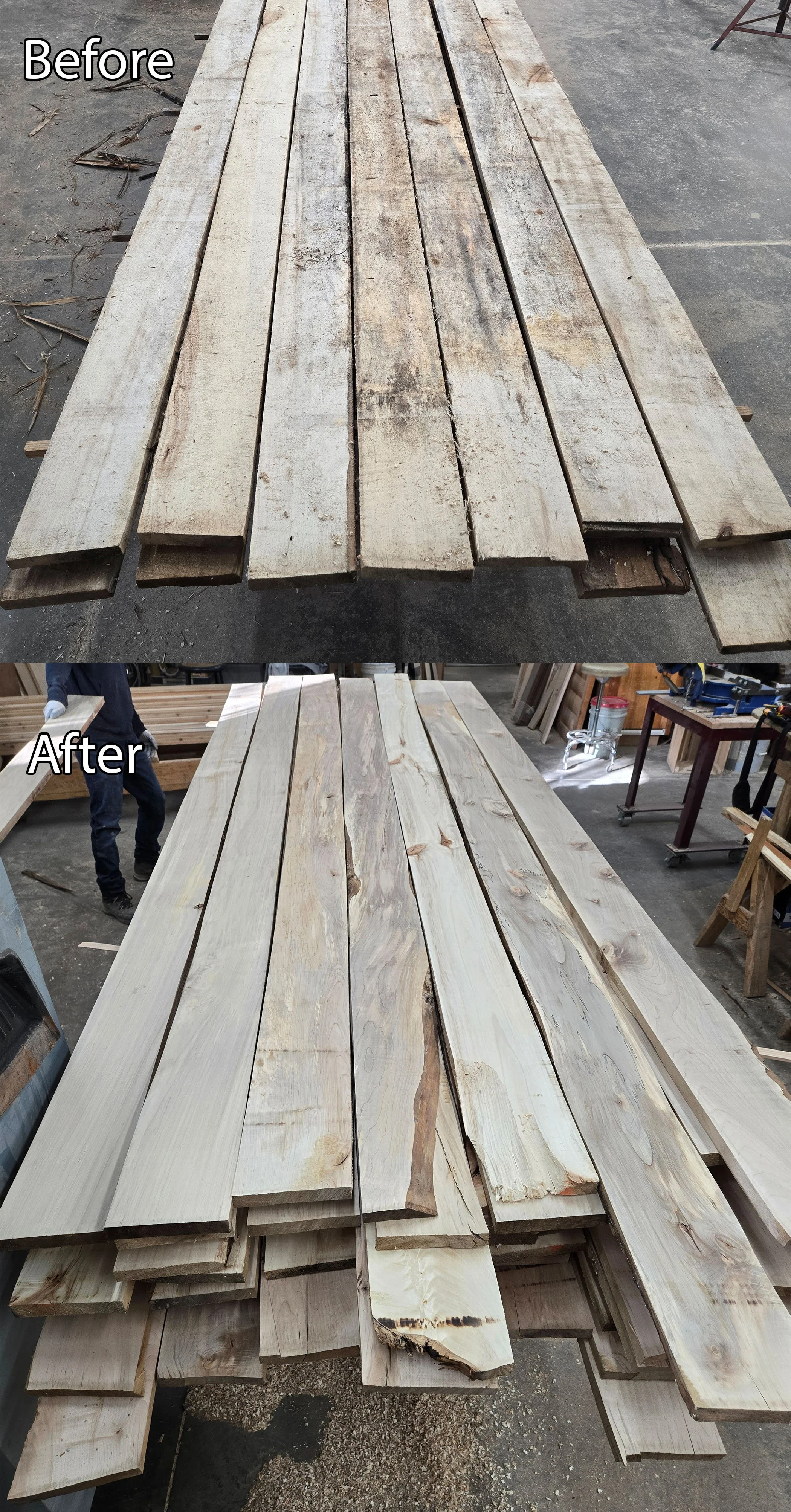 Customers wood. Kiln dried and planed. After this it was turned into paneling, end matched, and finished.